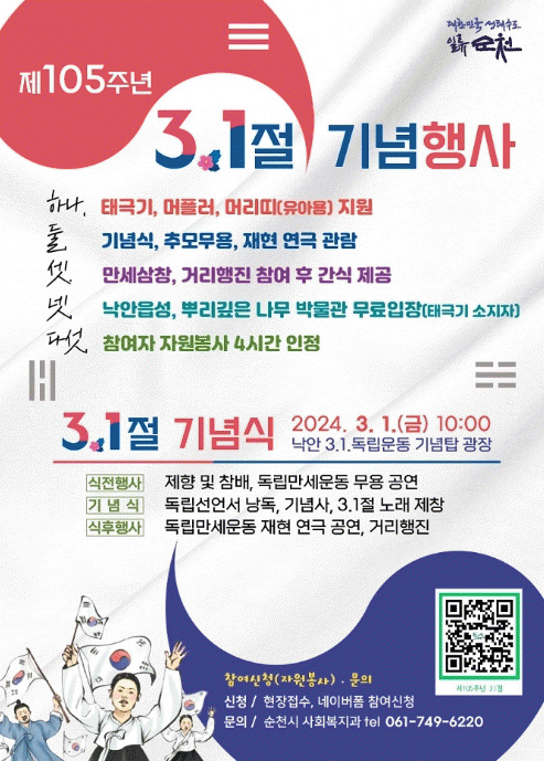 [¹Ìµð¾îÀü³² ÀÓ¼º¿Ï ±âÀÚ]¼øÃµ½Ã´Â ¿À´Â 3¿ù 1ÀÏ 10½Ã, ³«¾È3.1µ¶¸³¿îµ¿±â³äž ±¤Àå¿¡¼ Á¦105Áֳ⠻ïÀÏÀý ±â³äÇà»ç¸¦ °³ÃÖÇÑ´Ù°í ¹àÇû´Ù. Á¦105Áֳ⠻ïÀÏÀý ±â³äÇà»ç´Â dz¹°³îÀ̸¦ ½ÃÀÛÀ¸·Î µ¶¸³¸¸¼¼ Ã߸𹫿ë, µ¶¸³¼±¾ð¼ ³¶µ¶, ±â³ä»ç¡¦
