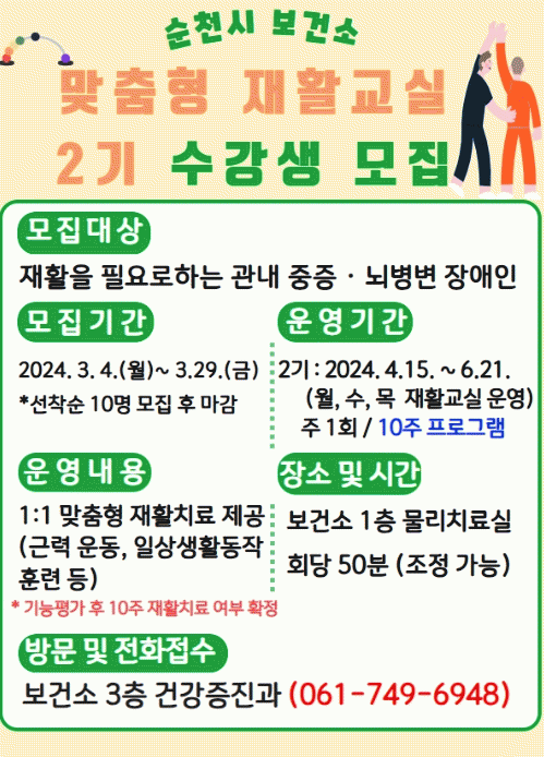 [¹Ìµð¾îÀü³² ÀÓ¼º¿Ï ±âÀÚ]¼øÃµ½Ã´Â 2¿ùºÎÅÍ ³úº´º¯, ôÃß Áúȯ µî Àå¾ÖÀÎÀ» ´ë»óÀ¸·Î ÀçȰÀü¹®°¡°¡ Á÷Á¢ °³Àκ° 1:1 ÀçȰ ¿îµ¿ ¼ºñ½º¸¦ Á¦°øÇÏ´Â ¡®¸ÂÃãÇü 1:1 ÀçȰ ¿îµ¿ ±³½Ç¡¯À» ¿î¿µÇϰí ÀÖ´Ù°í ¹àÇû´Ù. ÀÌ ¼ºñ½º´Â Áö¿ª»çȸÁß½ÉÀ硦