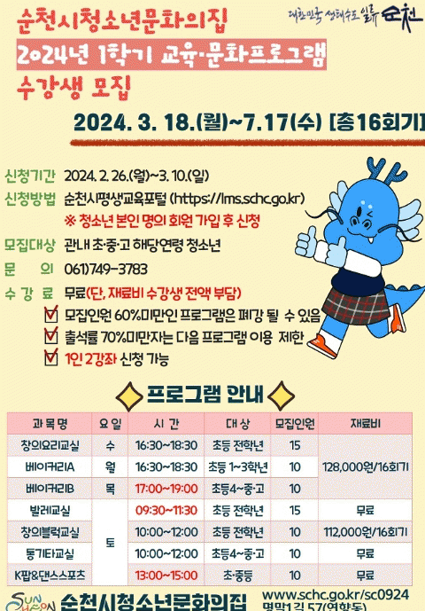 [¹Ìµð¾îÀü³² ÀÓ¼º¿Ï ±âÀÚ]¼øÃµ½Ã û¼Ò³â¹®ÈÀÇÁýÀº û¼Ò³âÀ» ´ë»óÀ¸·Î ¿À´Â 26ÀϺÎÅÍ 3¿ù 10ÀϱîÁö ¡®2024³â 1Çб⠱³À°¡¤¹®ÈÇÁ·Î±×·¥¡¯ ¼ö°»ýÀ» ¸ðÁýÇÑ´Ù°í ¹àÇû´Ù. û¼Ò³â¹®ÈÀÇÁý¿¡¼´Â ¸Å³â °ü³» û¼Ò³âÀ» ´ë»óÀ¸·Î û¼Ò³âµéÀÇ ÀÚ¡¦