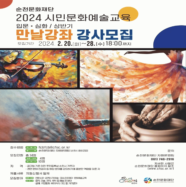 [¹Ìµð¾îÀü³² ÀÓ¼º¿Ï ±âÀÚ](Àç)¼øÃµ¹®ÈÀç´ÜÀº ¿À´Â 28ÀϱîÁö ¡®2024 ½Ã¹Î¹®È¿¹¼ú±³À° ¸¸³¯°Á¡¯ °»ç¸¦ °ø°³ ¸ðÁýÇÑ´Ù°í ¹àÇû´Ù. ¡®½Ã¹Î¹®È¿¹¼ú±³À° ¸¸³¯°Á¡¯´Â Áö¿ª ¿¹¼úÀÎ °»çµéÀÇ ´Ù¾çÇÑ ¿¹¼ú±³À°À» ÅëÇØ ½Ã¹ÎÀÇ½Ä °íÃë¿Í ¹®È¡¦