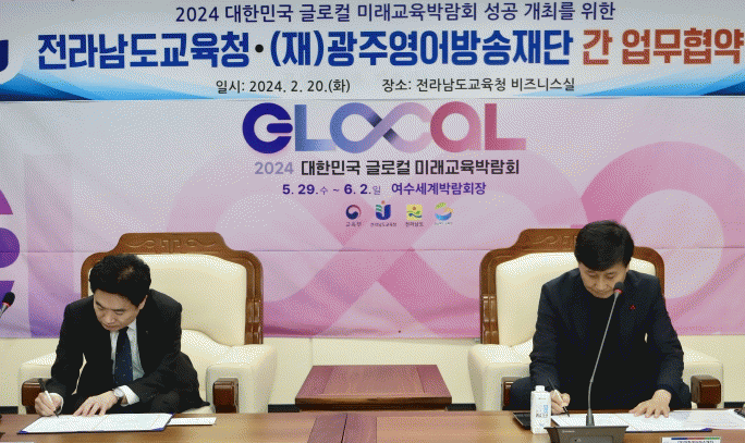 [¹Ìµð¾îÀü³² °í±Ô¼® ±âÀÚ]Àü¶ó³²µµ±³À°Ã»°ú (Àç)±¤ÁÖ¿µ¾î¹æ¼ÛÀÌ 20ÀÏ Àü¶ó³²µµ±³À°Ã»¿¡¼ ¡®2024 ´ëÇѹα¹ ±Û·ÎÄà ¹Ì·¡±³À° ¹Ú¶÷ȸ¡¯ ¼º°ø °³ÃÖ¸¦ À§ÇÑ ¾÷¹«Çù¾àÀ» ü°áÇß´Ù. ±è´ëÁß ±³À°°¨°ú ±èÈÖ »çÀåÀÌ ¼¸íÇÑ Çù¾à¼¿¡¼ µÎ ±â°üÀº ¡¦