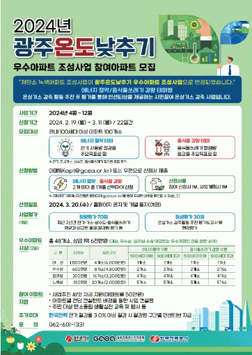 [¹Ìµð¾îÀü³² Á¦°¥´ëÁ¾ ±âÀÚ]±¤ÁÖ±¤¿ª½Ã´Â ¿Â½Ç°¡½º °¨Ãà »ýȰ ½Çõ»ç¾÷ÀÎ ¡®±¤Áֿµµ³·Ã߱⠿ì¼ö¾ÆÆÄÆ® Á¶¼º¡¯¿¡ Âü¿©ÇÒ ¾ÆÆÄÆ®¸¦ ¿À´Â 3¿ù 11ÀϱîÁö ¸ðÁýÇÑ´Ù. ¸ðÁý ´ë»óÀº ±¤ÁÖÁö¿ª 100¼¼´ë ÀÌ»ó °øµ¿ÁÖÅà 100°÷ÀÌ´Ù. ¿Â½Ç°¡½º °¨Ãà ¡¦