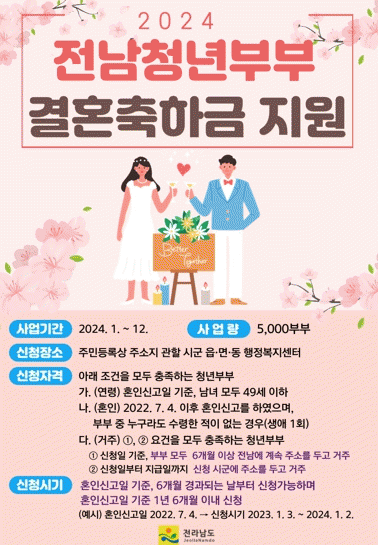 [¹Ìµð¾îÀü³² Á¦°¥´ëÁ¾ ±âÀÚ]Àü¶ó³²µµ´Â û³âÀÇ °áÈ¥ Ãʱ⠰æÁ¦Àû ºÎ´ãÀ» ´ú¾îÁÖ°í Áö¿ª Á¤ÂøÀ» À¯µµÇϱâ À§ÇØ ÃÑ 100¾ï ¿ø ±Ô¸ðÀÇ Ã»³âºÎºÎ °áÈ¥ÃàÇϱÝÀ» Áö¿øÇÑ´Ù°í ¹àÇû´Ù. û³âºÎºÎ °áÈ¥ÃàÇÏ±Ý Áö¿øÀº Àü³²µµ°¡ 2021³â Àü±¹ ±¤¿ª½Ã¡¦