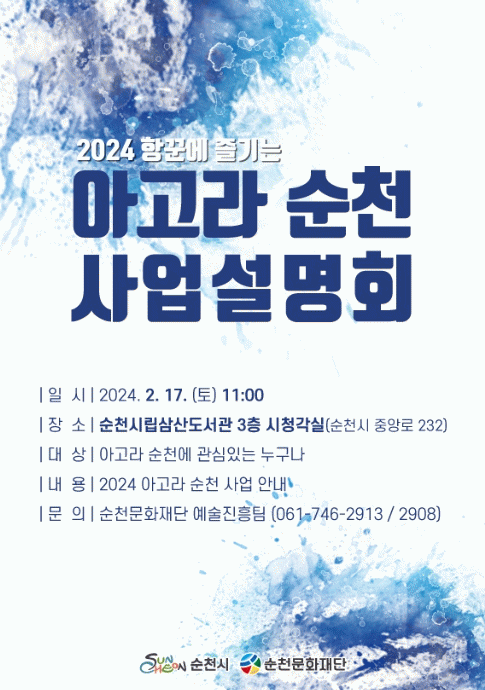 [¹Ìµð¾îÀü³² ÀÓ¼º¿Ï ±âÀÚ]¼øÃµ¹®ÈÀç´ÜÀº ¿À´Â 17ÀÏ 11½Ã, ¼øÃµ½Ã¸³»ï»êµµ¼°ü 3Ãþ ½Ãû°¢½Ç¿¡¼ Áö¿ª¿¹¼úÀΰú ÀÏ¹Ý ½Ã¹ÎÀ» ´ë»óÀ¸·Î ¡®2024 Çײۿ¡ Áñ±â´Â ¾Æ°í¶ó ¼øÃµ¡¯ »ç¾÷¼³¸íȸ¸¦ °³ÃÖÇÑ´Ù°í ¹àÇû´Ù. À̹ø »ç¾÷¼³¸íȸ´Â 2024³â ¾Æ¡¦