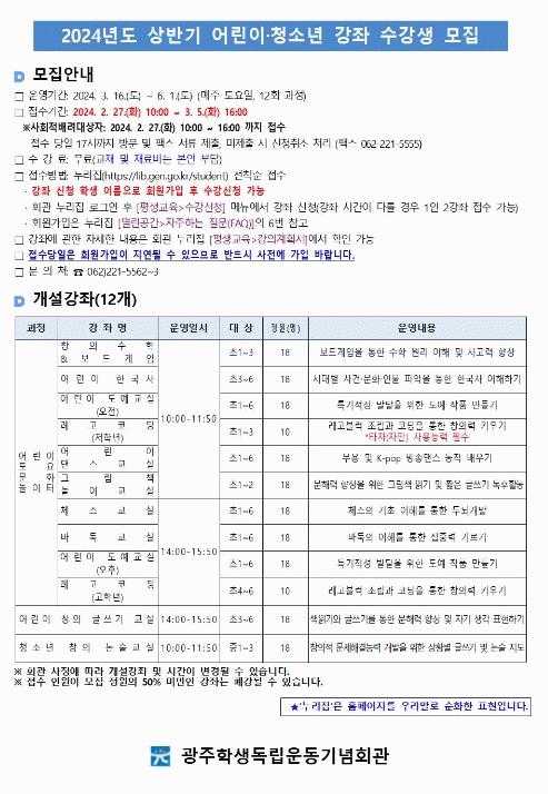 [¹Ìµð¾îÀü³² Á¦°¥´ëÁ¾ ±âÀÚ]±¤ÁÖÇлýµ¶¸³¿îµ¿±â³äȸ°üÀÌ Áö¿ªÁֹεéÀ» ´ë»óÀ¸·Î ¡®2024³âµµ »ó¹Ý±â Æò»ý±³À° ÇÁ·Î±×·¥¡¯ ¼ö°»ýÀ» ¸ðÁýÇÑ´Ù. 13ÀÏ ±¤ÁÖÇлýµ¶¸³¿îµ¿±â³äȸ°ü¿¡ µû¸£¸é À̹ø Æò»ý±³À° ÇÁ·Î±×·¥Àº ½Ã¹ÎµéÀÇ Àڱ⠰è¹ß°ú °Ç¡¦