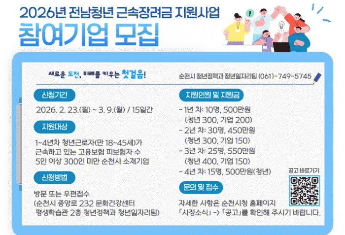 [¹Ìµð¾îÀü³² ÀÓ¼º¿Ï ±âÀÚ]¼øÃµ½Ã´Â Áö¿ª û³âµéÀÇ Á¤±ÔÁ÷ Ãë¾÷ ÃËÁø ¹× Àå±â±Ù¼ÓÀ» À¯µµÇϱâ À§ÇØ 2026³â Àü³² û³â ±Ù¼ÓÀå·Á±Ý Áö¿ø»ç¾÷ Âü¿© ±â¾÷À» ¸ðÁýÇÑ´Ù°í ¹àÇû´Ù. Àü³² û³â ±Ù¼ÓÀå·Á±Ý Áö¿ø»ç¾÷Àº µµºñ º¸Á¶»ç¾÷À¸·Î Áß¼Ò±â¾÷ ¡¦