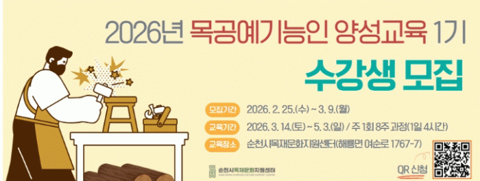 [¹Ìµð¾îÀü³² ÀÓ¼º¿Ï ±âÀÚ]¼øÃµ½Ã´Â ½Ã¹ÎµéÀÇ ¸ñ°ø üÇè ±âȸ¸¦ È®´ëÇÏ°í ¸ñÀç¹®È È°¼ºÈ¸¦ À§ÇØ ¡®2026³â ¸ñ°ø¿¹±â´ÉÀÎ ¾ç¼º±³À° 1±â¡¯ ¼ö°»ýÀ» ¿À´Â 3¿ù 9ÀϱîÁö ¸ðÁýÇÑ´Ù°í ¹àÇû´Ù. À̹ø ±³À°Àº ¸ñ°ø¿¡ °ü½ÉÀÖ´Â ½Ã¹Î ´©±¸³ª Âü¿©ÇÒ¡¦