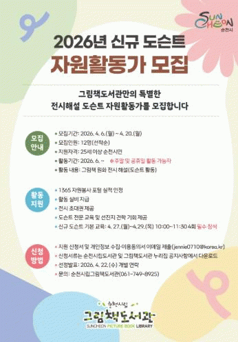 [¹Ìµð¾îÀü³² ÀÓ¼º¿Ï ±âÀÚ]¼øÃµ½Ã´Â ¼øÃµ½Ã¸³±×¸²Ã¥µµ¼°ü¿¡¼ ±×¸²Ã¥°ú ½Ã¹ÎÀ» ÀÕ´Â ¹®È ÇØ¼³ Ȱµ¿À» ÇÔ²²ÇÒ ½Å±Ô µµ½¼Æ® ÀÚ¿øÈ°µ¿°¡¸¦ ¸ðÁýÇÑ´Ù°í ¹àÇû´Ù. À̹ø ¸ðÁýÀº ½Ã¹Î¿¡°Ô µµ¼°ü Âü¿© ¹× »çȸ ºÀ»ç ±âȸ¸¦ Á¦°øÇϰí, Àü½Ã ¾È³»¡¦