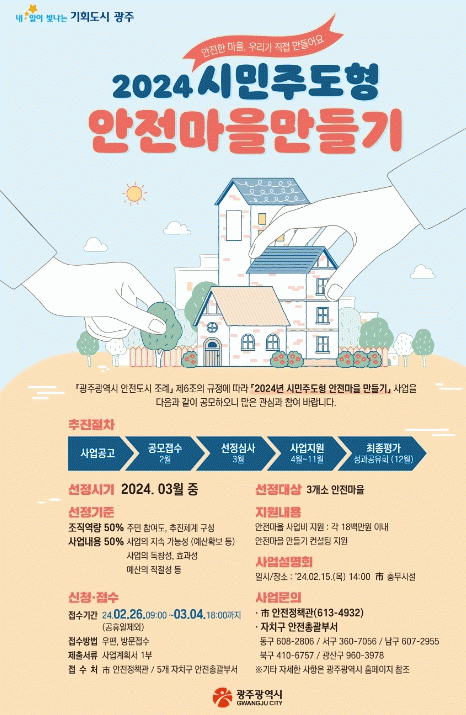 [¹Ìµð¾îÀü³² Á¦°¥´ëÁ¾ ±âÀÚ]±¤ÁÖ±¤¿ª½Ã´Â ¡®2024³âµµ ½Ã¹ÎÁÖµµÇü ¾ÈÀü¸¶À» ¸¸µé±â Áö¿ø»ç¾÷¡¯¿¡ Âü¿©ÇÒ ÁÖ¹ÎÇùÀÇü¸¦ ¿À´Â 26ÀϺÎÅÍ 3¿ù4ÀϱîÁö °ø°³¸ðÁýÇÑ´Ù. ±¤Áֽð¡ Áö³ÇغÎÅÍ ÃßÁøÇϰí ÀÖ´Â ¡®½Ã¹ÎÁÖµµÇü ¾ÈÀü¸¶À» ¸¸µé±â »ç¾÷¡¯Àº¡¦
