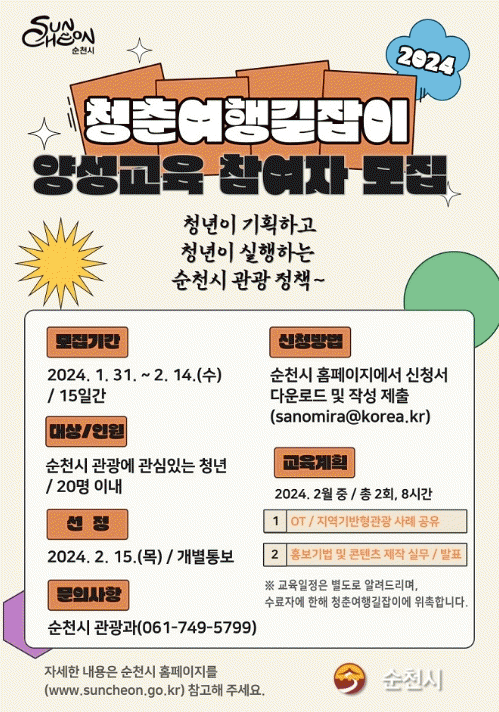 [¹Ìµð¾îÀü³² ÀÓ¼º¿Ï ±âÀÚ]¼øÃµ½Ã´Â Á¦9±â ûÃá¿©Çà±æÀâÀÌ(û³âÇØ¼³»ç)¸¦ ¿î¿µÇϱâ À§ÇÑ »çÀü ¾ç¼º±³À° Âü¿©ÀÚ¸¦ ¿À´Â 14ÀϱîÁö ¸ðÁýÇÑ´Ù°í ¹àÇû´Ù. ûÃá¿©Çà±æÀâÀÌ´Â Áö³ 2016³â óÀ½ Ãâ¹üÇÑ ÀÌÈÄ ³»ÀÏ·¯ °ü±¤ ¾È³», SNS È«º¸, ûÃáÆä½º¡¦