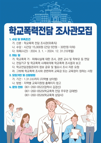 [¹Ìµð¾îÀü³² °í±Ô¼® ±âÀÚ]Àü¶ó³²µµ±³À°Ã»ÀÌ 1¿ù Áß ¸ðÁý, 2¿ù Áß 22°³ ±³À°Áö¿øÃ»¿¡ Çб³Æø·ÂÀü´ãÁ¶»ç°ü 198¸íÀ» À§ÃËÇÏ¿©, Çб³Æø·Â ¹ß»ý ½Ã Çб³ ³»¡¤¿Ü ¿©ºÎ¿Í »ó°ü¾øÀÌ »ç¾È Á¶»ç¿¡ ³ª¼±â·Î Çß´Ù. À̹ø¿¡ À§ÃËÇϰíÀÚ ÇÏ´Â Çб³Æø·Â¡¦