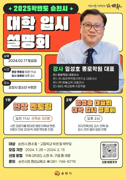 [¹Ìµð¾îÀü³² ÀÓ¼º¿Ï ±âÀÚ]¼øÃµ½Ã´Â ¹Ì·¡ÀÎÀç ¾ç¼ºÀ» À§ÇØ ÇлýµéÀÇ ¼º°øÀûÀÎ Áø·Î¡¤ÁøÇÐÀ» Áö¿øÇϰíÀÚ ¿À´Â 2¿ù 17ÀÏ ¿ÀÀü 11½Ã ¼øÃµ½Ãû¼Ò³â¼ö·Ã°ü¿¡¼¡®2025Çг⵵ ´ëÇÐ ÀԽü³¸íȸ¡¯¸¦ °³ÃÖÇÑ´Ù°í ¹àÇû´Ù. À̹ø ¼³¸íȸ´Â 1ºÎ¿Í 2ºÎ¡¦