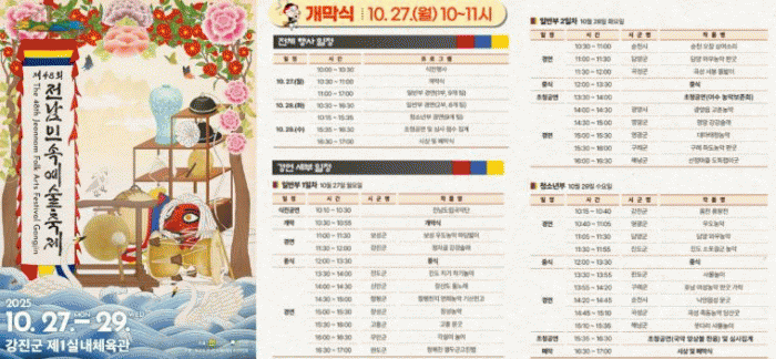 [¹Ìµð¾îÀü³² °í±Ô¼® ±âÀÚ]Á¦48ȸ Àü¶ó³²µµ ¹Î¼Ó¿¹¼úÃàÁ¦°¡ ¿À´Â 27ÀϺÎÅÍ 29ÀϱîÁö 3Àϰ£ °Áø±º Á¦1½Ç³»Ã¼À°°ü ÀÏ¿ø¿¡¼ ¿¸°´Ù. À̹ø ÃàÁ¦´Â Àü³²ÀÇ ÀüÅë ¹Î¼Ó¿¹¼úÀ» º¸Á¸¡¤°è½ÂÇÏ°í µµ¹Î ÈÇÕÀ» µµ¸ðÇϱâ À§ÇØ ¸Å³â À̾îÁö´Â Àü³²ÀÇ ¡¦