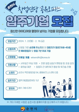 [¹Ìµð¾îÀü³² ÀÓ¼º¿Ï ±âÀÚ]¼øÃµ½Ã´Â »ç¹«°ø°£ÀÌ ÇÊ¿äÇÑ Ã¢¾÷ 7³â À̳»ÀÇ Ã»³â »ç¾÷°¡¿Í ¿¹ºñ û³â â¾÷ÀÚ¸¦ ´ë»óÀ¸·Î â¾÷¿¬´ç(¼øÃµ½Ã â¾÷Áö¿ø¼¾ÅÍ) ³» °øÀ¯¿ÀÇǽº ÀÔÁÖ±â¾÷À» ¿À´Â 2¿ù 16ÀϱîÁö ¸ðÁýÇÑ´Ù°í ¹àÇû´Ù. ¡®Ã¢¾÷ÀÇ ¹®À» ¿¬´Ù¡¦
