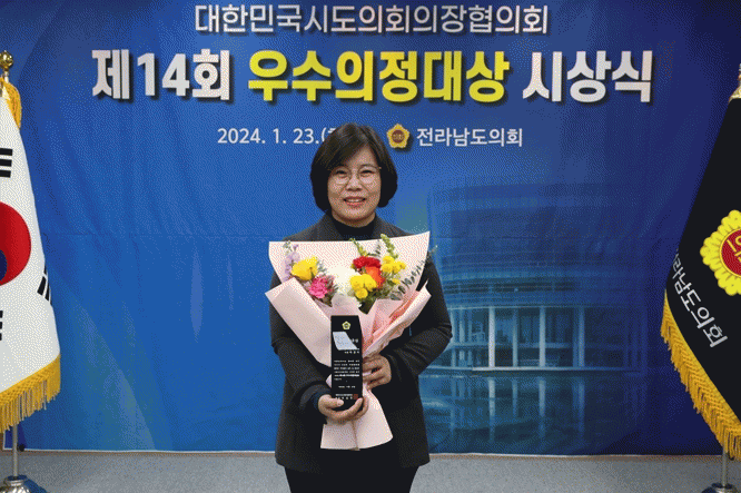 [¹Ìµð¾îÀü³² Á¦°¥´ëÁ¾ ±âÀÚ]Àü¶ó³²µµÀÇȸ ÁÖÁ¾¼· ÀÇ¿ø(´õºÒ¾î¹ÎÁÖ´ç, ¿©¼ö6)ÀÌ 1¿ù 23ÀÏ ´ëÇѹα¹½ÃµµÀÇÀåÇùÀÇȸ°¡ ¼ö¿©ÇÏ´Â ¡®Á¦14ȸ ¿ì¼öÀÇÁ¤´ë»ó¡¯À» ¼ö»óÇß´Ù. ¡®¿ì¼öÀÇÁ¤´ë»ó¡¯Àº ´ëÇѹα¹½ÃµµÀÇȸÀÇÀåÇùÀÇȸ°¡ ¸Å³â ±¤¿ªÀÇȸ¿¡¼¡¦