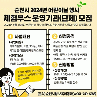 [¹Ìµð¾îÀü³² ÀÓ¼º¿Ï ±âÀÚ]¼øÃµ½Ã°¡ 2024³â 5¿ù 4ÀÏ¿¡ °³Ãֵɡ®Á¦102ȸ ¾î¸°À̳¯ Çà»ç¡¯ÀÇ ¼º°ø °³ÃÖ¸¦ À§ÇØ ¹Ì·¡±â¼ú, ¾Ö´Ï¸ÞÀÌ¼Ç µî °¢Á¾ üÇè ÇÁ·Î±×·¥À» ¿î¿µÇÒ ±â°ü(´Üü)¸¦ ¸ðÁýÇÑ´Ù°í ¹àÇû´Ù. °ø°íÀÏ ±âÁØ ±¤ÁÖ ¶Ç´Â Àü³² ¼ÒÀç ¾Æ¡¦