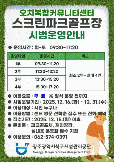[¹Ìµð¾îÀü³² Á¦°¥´ëÁ¾ ±âÀÚ]±¤ÁÖ±¤¿ª½ÃºÏ±¸½Ã¼³°ü¸®°ø´ÜÀº ¿ÀÄ¡º¹ÇÕÄ¿¹Â´ÏƼ¼¾ÅÍ 4Ãþ¿¡ ºÏ±¸ °ü³» ÃÖÃÊÀÇ °ø°ø ½Ç³» ½ºÅ©¸°ÆÄÅ©°ñÇÁÀåÀ» Á¶¼ºÇϰí, ¿À´Â 16ÀÏ ½Ã¹ü¿î¿µ¿¡ µé¾î°£´Ù°í ¹àÇû´Ù. »õ·Ó°Ô ¹®À» ¿¬ ½ºÅ©¸°ÆÄÅ©°ñÇÁÀåÀº ½ºÅ©¸°¡¦