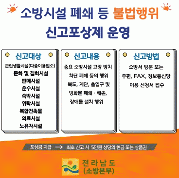 [¹Ìµð¾îÀü³² Á¦°¥´ëÁ¾ ±âÀÚ]Àü³²¼Ò¹æº»ºÎ°¡ ºñ»ó±¸ Æó¼â µî ¼Ò¹æ½Ã¼³ÀÇ ºÒ¹ýÇàÀ§¿¡ ´ëÇÑ ½Å°íÆ÷»óÁ¦¸¦ ¿¬Áß ¿î¿µÇÑ´Ù. ºÒ¹ýÇàÀ§ ½Å°íÆ÷»óÁ¦´Â ºñ»ó±¸ Æó¼â¡¤Àá±Ý, À§¹ýÇÑ ¼Ò¹æ½Ã¼³À» ½Å°íÇÏ¸é Æ÷»ó±ÝÀ» Áö±ÞÇÏ´Â Á¦µµÀÌ´Ù. °Ç¹° °ü°èÀΡ¦