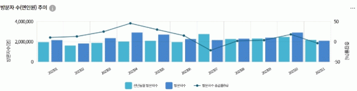 [¹Ìµð¾îÀü³² ÀÓ¼º¿Ï ±âÀÚ]Çѱ¹°ü±¤°ø»çÀÇ Çѱ¹°ü±¤ µ¥ÀÌÅÍ·¦ ºÐ¼® °á°ú Áö³ÇØ 1¿ùºÎÅÍ 11¿ù±îÁö ¼øÃµ½Ã¸¦ ´Ù³à°£ ¹æ¹®°´ÀÌ 2,586¸¸6,958¸íÀ¸·Î Áý°èµÆ´Ù. ¼øÃµ½Ã´Â 2022³â °°Àº ±â°£ ´ëºñ Áõ°¡À² 11%·Î Àü³² ÃÖ°í Áõ°¡À²À» º¸¿´´Ù. Àü±¹¡¦