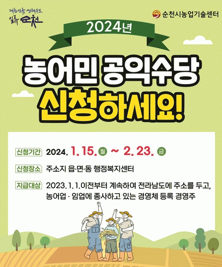 [¹Ìµð¾îÀü³² ÀÓ¼º¿Ï ±âÀÚ]¼øÃµ½Ã´Â ¿À´Â 15ÀϺÎÅÍ 2¿ù 23ÀϱîÁö ¡®2024³â ³ó¾î¹Î °øÀͼö´ç¡¯½ÅûÀ» ÁÖ¼ÒÁö °üÇÒ À¾¸éµ¿ ÇàÁ¤º¹Áö¼¾ÅÍ¿¡¼ Á¢¼öÇÑ´Ù°í ¹àÇû´Ù. ¡®³ó¾î¹Î °øÀͼö´ç¡¯Àº ³ó¾î¹Î¡¤ÀÓ¾÷ÀÎ »îÀÇ Áú Çâ»ó°ú ³ó¾î¾÷¡¤³ó¾îÃÌÀÇ Áö¡¦