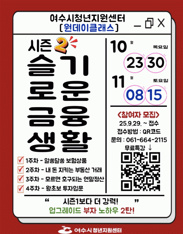 [¹Ìµð¾îÀü³² ÀüÇü¼º ±âÀÚ]¿©¼ö½Ã´Â ¿À´Â 10¿ù 23ÀÏ ¿ÀÈÄ 6½Ã 30ºÐ ¿©¼ö½Ãû³âÁö¿ø¼¾ÅÍ¿¡¼ û³âµéÀÇ ±ÝÀ¶ ÀÌÇØµµ Çâ»ó°ú °ÇÀüÇÑ ±ÝÀ¶ ½À°ü Çü¼ºÀ» À§ÇÑ ¹«·á Ư° ¡®½ÃÁð2 ½½±â·Î¿î ±ÝÀ¶»ýȰ¡¯ ÀÏÀÏ °Á¸¦ ¿î¿µÇÑ´Ù. À̹ø Ư°Àº ÃÑ 4ȸ¡¦