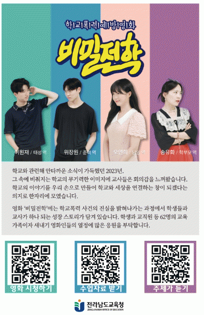 [¹Ìµð¾îÀü³² °í±Ô¼® ±âÀÚ]Àü¶ó³²µµ±³À°Ã»ÀÌ Çб³Æø·Â¿¹¹æÀ» ÁÖÁ¦·Î ¸¸µç ¿µÈ 'ºñ¹ÐÀüÇÐ'ÀÌ Áö³ 14Àϰú 18ÀÏ È£Æò ¼Ó¿¡ ½Ã»çȸ¸¦ ¸¶Ä¡°í ´©±¸³ª º¼ ¼ö ÀÖµµ·Ï ¼ö¾÷ÀÚ·á¿Í ÇÔ²² °ø°³µÈ´Ù. À̹ø ¿µÈ ¡®ºñ¹ÐÀüÇС¯ ½Ã»çȸ¿¡´Â ´«ÀÌ ¿À´Â¡¦