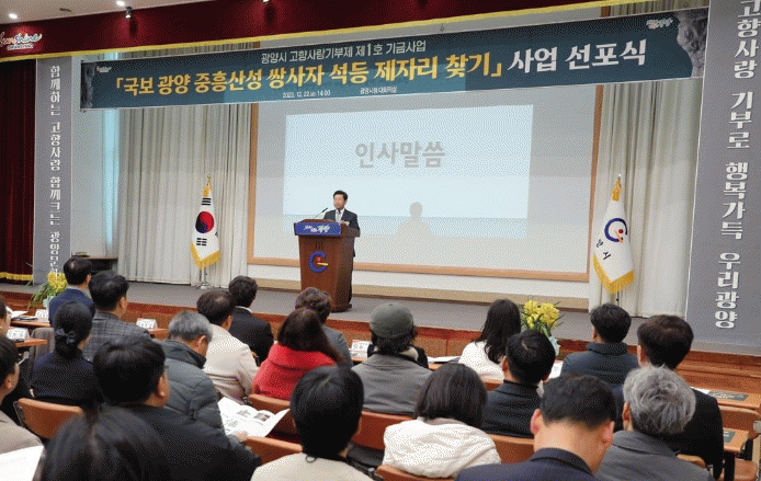 [¹Ìµð¾îÀü³² ÀÓ¼º¿Ï ±âÀÚ]±¤¾ç½Ã´Â Áö³ 22ÀÏ ½Ãû ´ëȸÀǽǿ¡¼ '±¹º¸ ±¤¾ç ÁßÈï»ê¼º ½Ö»çÀÚ ¼®µî Á¦ÀÚ¸® ã±â'»ç¾÷À» ±¤¾ç½Ã °íÇâ»ç¶û±âºÎÁ¦ Á¦1È£ ±â±Ý»ç¾÷À¸·Î ¼±Æ÷Çß´Ù°í ¹àÇû´Ù. À̹ø Á¦1È£ ±â±Ý»ç¾÷ ¼±Æ÷½ÄÀº ¡®ÇÔ²²ÇÏ´Â °íÇâ»ç¶û¡¦
