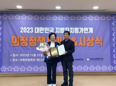 [¹Ìµð¾îÀü³² °í±Ô¼® ±âÀÚ]Àü³²µµÀÇȸ ÃÖ¹«°æ ÀÇ¿ø(´õºÒ¾î¹ÎÁÖ´ç¤ý¿©¼ö4)ÀÌ 12¿ù 22ÀÏ, ¿©ÀǵµÁ¤Ã¥¿¬±¸¿ø¿¡¼ ÁÖÃÖÇÏ´Â ¡®2023 ´ëÇѹα¹ Áö¹æÀÚÄ¡Æò°¡ ÀÇÁ¤Á¤Ã¥´ë»ó¡¯ ÃÖ¿ì¼ö»óÀ» ¼ö»óÇß´Ù. ¡®2023 ´ëÇѹα¹ Áö¹æÀÚÄ¡Æò°¡ ÀÇÁ¤Á¤Ã¥´ë»ó¡¯¡¦