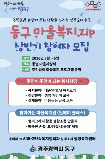 [¹Ìµð¾îÀü³² Á¦°¥´ëÁ¾ ±âÀÚ]±¤ÁÖ µ¿±¸´Â ÁֹΠ´©±¸³ª ÀÏ»ó ¼Ó¿¡¼ º¹Áö¸¦ ¹è¿ì°í Âü¿©ÇÒ ¼ö ÀÖ´Â ¡®µ¿±¸ ¸¶À»º¹Áö.ZIP¡¯ »ç¾÷À» ¿À´Â 3¿ùºÎÅÍ º»°Ý ÃßÁøÇÑ´Ù°í ¹àÇû´Ù. ¡®¸¶À»º¹Áö.ZIP¡¯Àº ÁÖ¹ÎÀÌ »ýȰ ¼Ó¿¡¼ º¹Áö¸¦ ÀÚ¿¬½º·´°Ô ¹è¿ì°í¡¦