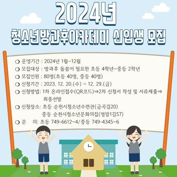 [¹Ìµð¾îÀü³² ÀÓ¼º¿Ï ±âÀÚ]¼øÃµ½Ã´Â ¿À´Â 20ÀϺÎÅÍ 29ÀϱîÁö 2024³â û¼Ò³â¹æ°úÈľÆÄ«µ¥¹Ì ½ÅÀÔ»ý 80¸íÀ» ¸ðÁýÇÑ´Ù. ´ë»óÀº Áö¿ª ³»¿¡¼ ¹æ°ú ÈÄ µ¹º½ÀÌ ÇÊ¿äÇÑ ÃʵîÇб³ 4~6Çгâ 40¸í(û¼Ò³â¼ö·Ã°ü)°ú ÁßÇб³ 1~2Çгâ 40¸í(û¼Ò³â¹®ÈÀÇ¡¦
