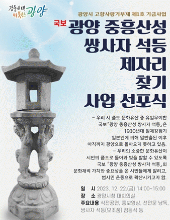 [¹Ìµð¾îÀü³² ÀÓ¼º¿Ï ±âÀÚ]±¤¾ç½Ã´Â ±¤¾ç½Ã °íÇâ»ç¶û±âºÎÁ¦ Á¦1È£ ±â±Ý»ç¾÷À¸·Î ¼±Á¤µÈ ¡®±¹º¸ ±¤¾ç ÁßÈï»ê¼º ½Ö»çÀÚ ¼®µî Á¦ÀÚ¸® ã±â »ç¾÷¡¯ ¼±Æ÷½ÄÀ» ¿À´Â 22ÀÏ ½Ãû ´ëȸÀǽǿ¡¼ °³ÃÖÇÑ´Ù°í ¹àÇû´Ù. ±¤¾ç½Ã ÃâÅä ¹®ÈÀ¯»ê Áß À¯ÀÏÇÑ¡¦