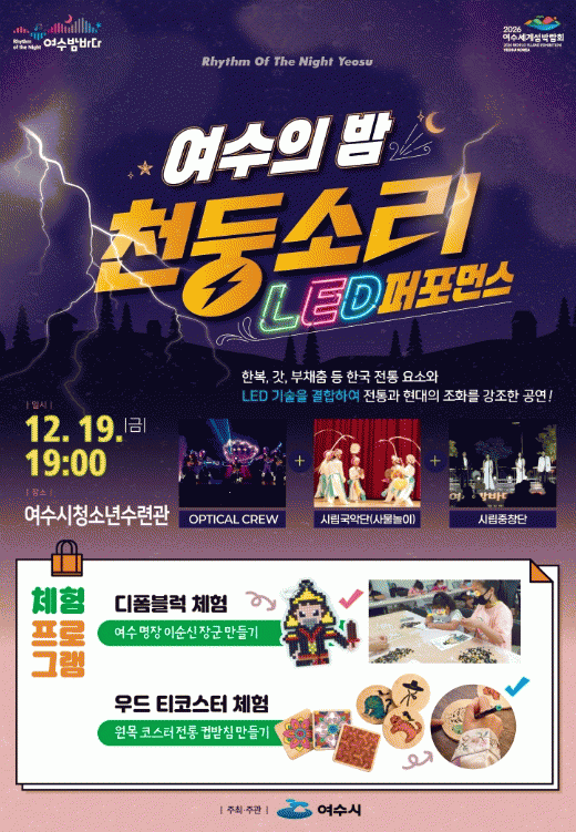 [¹Ìµð¾îÀü³² ÀüÇü¼º ±âÀÚ]¿©¼ö½Ã´Â ¿À´Â 19ÀÏ¿¡ ½ÖºÀµ¿¿¡ À§Ä¡ÇÑ ¿©¼ö½Ãû¼Ò³â¼ö·Ã°ü °ø¿¬Àå¿¡¼ ¡®¿©¼öÀÇ ¹ã, õµÕ¼Ò¸®¡¯ 3ȸÂ÷ °ø¿¬À» °³ÃÖÇÑ´Ù. À̹ø 3ȸÂ÷´Â Çѱ¹ÀÇ ÀüÅë¹Ì¸¦ ´ãÀº ºÎäÃã°ú »ó¸ðµ¹¸®±â¸¦ LED ½Å±â¼ú, ·¹ÀÌÀú ÆÛÆ÷¸Õ¡¦