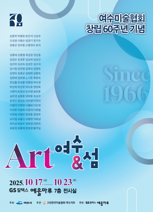 [¹Ìµð¾îÀü³² ÀüÇü¼º ±âÀÚ]¿©¼ö½Ã´Â ¿À´Â 10¿ù 17ºÎÅÍ 23ÀϱîÁö 7Àϰ£ GSĮŨ½º ¿¹¿ï¸¶·ç Àü½Ã½Ç¿¡¼ ¡®¿©¼ö¹Ì¼úÇùȸ ⸳ 60Áֳ⠱â³ä ±âȹÀü 'Art ¿©¼ö ¡¤ ¼¶'¡¯À» °³ÃÖÇÑ´Ù. À̹ø Àü½Ã´Â Çѱ¹¹Ì¼úÇùȸ ¿©¼öÁöºÎ ÁÖ°üÀ¸·Î 1965³â ⸳ ¡¦