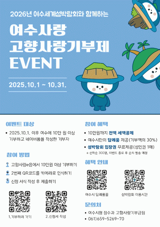 [¹Ìµð¾îÀü³² ÀüÇü¼º ±âÀÚ]¿©¼ö½Ã´Â 10¿ù ÇÑ ´Þ°£ 10¸¸ ¿ø ÀÌ»ó °íÇâ»ç¶û±âºÎ¿¡ Âü¿©ÇÑ ±âºÎÀÚ ¼±Âø¼ø 300¸í¿¡°Ô ¡®2026¿©¼ö¼¼°è¼¶¹Ú¶÷ȸ¡¯ ÀÔÀå±ÇÀ» ÁõÁ¤Çϴ Ưº° À̺¥Æ®¸¦ ÁøÇàÇϰí ÀÖ´Ù°í ¹àÇû´Ù. À̹ø À̺¥Æ®´Â °íÇâ»ç¶û±âºÎÁ¦ Âü¿©¡¦