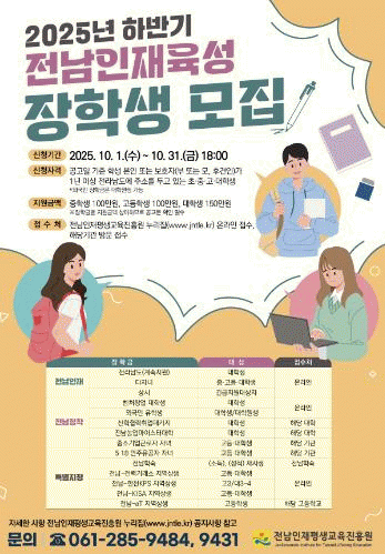 [¹Ìµð¾îÀü³² Á¦°¥´ëÁ¾ ±âÀÚ]Àü¶ó³²µµ¿Í Àü³²ÀÎÀçÆò»ý±³À°ÁøÈï¿øÀº ½ÇÁúÀûÀÎ ±³À°±âȸ º¸Àå°ú ¹Ì·¡ÀÎÀç·ÎÀÇ ¼ºÀå, Áö¿ª Á¤ÂøÀ» Áö¿øÇϱâ À§ÇÑ 2025³â ÇϹݱâ Àü³²ÀÎÀçÀ°¼º ÀåÇлýÀ» ¿À´Â 31ÀϱîÁö ¸ðÁýÇÑ´Ù. ½Åû ´ë»óÀº °ø°íÀÏ ±âÁØ Çлý¡¦
