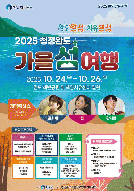 [¹Ìµð¾îÀü³² Á¦°¥´ëÁ¾ ±âÀÚ]¿Ïµµ±ºÀº 10¿ù 24ÀϺÎÅÍ 26ÀϱîÁö 3Àϰ£ ¿Ïµµ ÇØº¯°ø¿ø°ú ÇØ¾çÄ¡À¯¼¾ÅÍ ÀÏ¿ø¿¡¼ '2025 ûÁ¤ ¿Ïµµ °¡À» ¼¶ ¿©Çà' Çà»ç¸¦ °³ÃÖÇÑ´Ù. ¿ÃÇØ Çà»çÀÇ ÁÖÁ¦´Â ¡®¿Ïµµ¿Ô¼¶ Ä¡À¯µÆ¼¶¡¯À̸ç, ûÁ¤ÇÑ ÀÚ¿¬È¯°æ°ú ÇØ¾çÄ¡¡¦