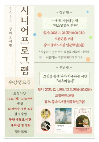 [¹Ìµð¾îÀü³² ÀÓ¼º¿Ï ±âÀÚ]±¤¾çÁ߸¶µµ¼°üÀÌ ¿À´Â 13ÀϺÎÅÍ 50¼¼ ÀÌ»ó ¼ºÀÎÀ» ´ë»óÀ¸·Î '2023 ½Ã´Ï¾î ÇÁ·Î±×·¥' Âü°¡ÀÚ¸¦ ¸ðÁýÇÑ´Ù°í ¹àÇû´Ù. À̹ø ÇÁ·Î±×·¥Àº ÀºÅð ÈÄ ½Ç¹ö¼¼´ëÀÇ °Ç°ÇÑ ³ëÈĸ¦ À§ÇÑ ½Ã´Ï¾î ÇÁ·Î±×·¥ ¿î¿µÀ¸·Î 50¼¼ ÀÌ»ó¡¦