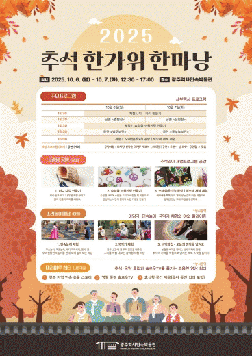 [¹Ìµð¾îÀü³² Á¦°¥´ëÁ¾ ±âÀÚ]±¤ÁÖ¿ª»ç¹Î¼Ó¹Ú¹°°üÀº Ãß¼® ¸íÀýÀ» ¸Â¾Æ ¿À´Â 6ÀϺÎÅÍ 7ÀϱîÁö ÀÌÆ²°£ ¡®2025³â Ãß¼® ÇѰ¡À§ ÇѸ¶´ç¡¯À» °³ÃÖÇÑ´Ù. À̹ø Çà»ç´Â ±¤ÁÖ¿ª»ç¹Î¼Ó¹Ú¹°°ü º»°ü°ú ¾ß¿Ü¸¶´ç¿¡¼ ÁøÇàµÇ¸ç, ³²³à³ë¼Ò ¿Â °¡Á·ÀÌ ÇÔ²²¡¦