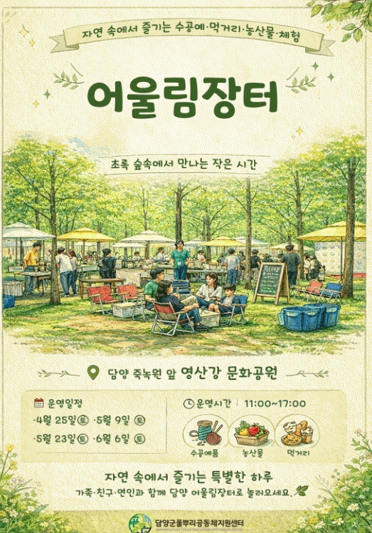 [¹Ìµð¾îÀü³² Á¦°¥´ëÁ¾ ±âÀÚ] ´ã¾ç±º Ç®»Ñ¸®°øµ¿Ã¼Áö¿ø¼¾ÅͰ¡ Áö¿ª °øµ¿Ã¼¿Í ¼Ò»ó°øÀÎÀÇ »ó»ýÀ» µ½°í Áö¿ª °æÁ¦¸¦ »ì¸®±â À§ÇÑ ¡®2026³â ¾î¿ï¸²ÀåÅÍ¡¯¸¦ ¿À´Â 6¿ù±îÁö ÃÑ 4ȸ ¿î¿µÇÑ´Ù. ¡®¾î¿ï¸²ÀåÅÍ¡¯´Â ´ã¾ç °ü³» Ç®»Ñ¸®°øµ¿Ã¼¿Í ³ó¡¦