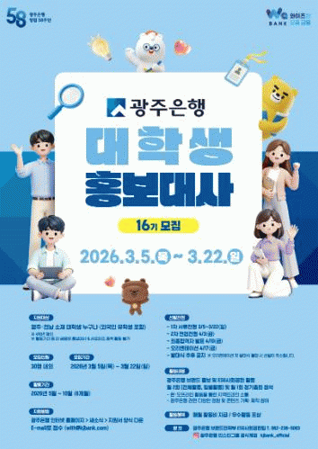 [¹Ìµð¾îÀü³² Á¦°¥´ëÁ¾ ±âÀÚ]±¤ÁÖÀºÇàÀº ¿À´Â 5ÀϺÎÅÍ ±¤ÁÖ¡¤Àü³² Áö¿ª ¼ÒÀç ´ëÇлýÀ» ´ë»óÀ¸·Î ¡®Á¦16±â ´ëÇлý È«º¸´ë»ç¡¯¸¦ ¸ðÁýÇÑ´Ù°í ¹àÇû´Ù. ¸ðÁý ´ë»óÀº ±¤ÁÖ¡¤Àü³² Áö¿ª ´ëÇп¡ ÀçÇÐ ÁßÀÎ 1~3Çгâ»ý(ÈÞÇлý Æ÷ÇÔ)À̸ç, À̹ø 16±â¡¦