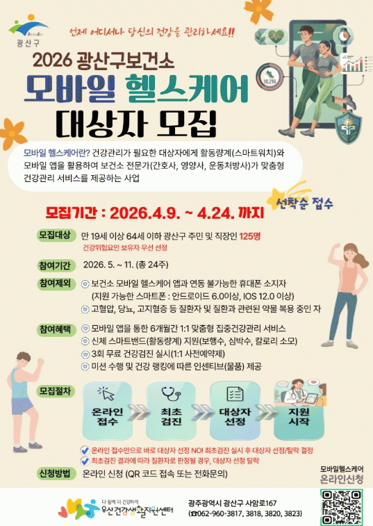 [¹Ìµð¾îÀü³² Á¦°¥´ëÁ¾ ±âÀÚ] ±¤ÁÖ ±¤»ê±¸´Â Á¤º¸Åë½Å±â¼ú(ICT)À» Ȱ¿ëÇØ ÁֹεéÀÇ °Ç°À» ì±â´Â ¡®2026³â ¸ð¹ÙÀÏ ÇコÄɾ »ç¾÷À» º»°ÝÀûÀ¸·Î ¿î¿µÇÑ´Ù°í ¹àÇû´Ù. À̹ø »ç¾÷Àº ½º¸¶Æ®Æù ¾Û°ú Ȱµ¿·®°è¸¦ ¿¬µ¿ÇØ Àü¹®°¡°¡ ½Ã°£°ú Àå¼Ò¡¦
