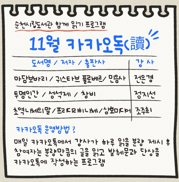 [¹Ìµð¾îÀü³² ÀÓ¼º¿Ï ±âÀÚ]¼øÃµ½Ã¸³µµ¼°üÀº ¿Â¶óÀο¡¼ ÇÔ²² Ã¥À» Àд 11¿ù īī¿Àµ¶(ÔÁ) ¼ö°»ýÀ» ¸ðÁýÇÑ´Ù°í ¹àÇû´Ù. īī¿Àµ¶(ÔÁ)Àº Ã¥ ÇÑ ±ÇÀ» ¿Ïµ¶ÇÏ°í ½ÍÁö¸¸ Áßµµ¿¡ Æ÷±âÇϰųª, µ¶¼ ¸ðÀÓÀ» ÇÏ°í ½ÍÁö¸¸ ½Ã°£ Á¦¾àÀ¸·Î Âü¿©ÇÏ¡¦