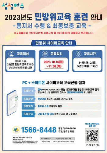 [¹Ìµð¾îÀü³² ÀüÇü¼º ±âÀÚ]¿©¼ö½Ã´Â ¿À´Â 16ÀϺÎÅÍ 11¿ù 30ÀϱîÁö 2023³âµµ ¸¶Áö¸· ¹Î¹æÀ§´ë¿ø »çÀ̹ö 2Â÷ º¸Ãæ±³À°À» ½Ç½ÃÇÑ´Ù. ±³À° ´ë»óÀÚ´Â ¿©¼ö½Ã¿¡ ÁÖ¼Ò¸¦ µÐ ¸¸ 20~40¼¼±îÁö ¹Î¹æÀ§ ´ë¿ø Áß »ó¹Ý±â ±âº»±³À° ¹× 1Â÷ º¸Ãæ±³À° ¹Ì ÀÌ¡¦