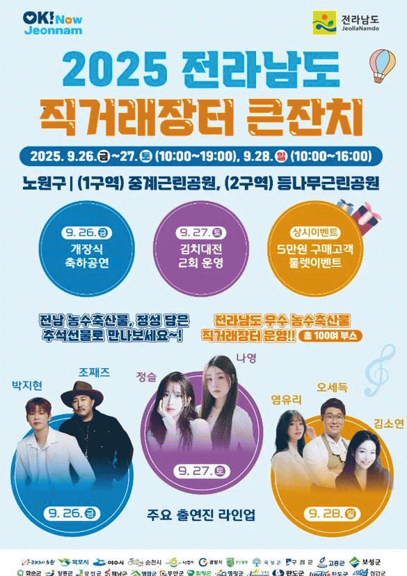 [¹Ìµð¾îÀü³² °í±Ô¼® ±âÀÚ]Àü³² ¿µ¾Ï±ºÀº Áö³ 9¿ù 26ÀϺÎÅÍ 28ÀϱîÁö ¼¿ï½Ã ³ë¿ø±¸ Áß°è±Ù¸°°ø¿ø¿¡¼ ¿¸°'2025 Àü¶ó³²µµ Á÷°Å·¡ÀåÅÍ Å«ÀÜÄ¡'¿¡ Âü¿©ÇØ ´ëÇ¥ ³óƯ»ê¹°ÀÎ ¹«È°ú, ¹è, ¸á·ÐÀ» ¼±º¸À̸ç ÃÑ 1õ200¸¸ ¿øÀÇ ÆÇ¸Å ½ÇÀûÀ» °Åµ×¡¦