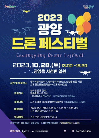 [¹Ìµð¾îÀü³² ÀÓ¼º¿Ï ±âÀÚ]±¤¾ç½Ã´Â ¿À´Â 28ÀÏ ±¤¾çÀ¾ ¼Ãµº¯ ÀÏ¿ø¿¡¼ ¡®2023³â ±¤¾ç µå·Ð Æä½ºÆ¼¹ú¡¯À» °³ÃÖÇÑ´Ù°í ¹àÇû´Ù. À̹ø µå·Ð Æä½ºÆ¼¹úÀº ¿ÀÈÄ 1½ÃºÎÅÍ ¿ÀÈÄ 6½Ã 20ºÐ±îÁö ÁøÇàµÇ¸ç Ç︮ÄßÅÍ ÆÛÆ÷¸Õ½º, µå·Ð ±ºÁý°ø¿¬, µå·Ð ¶ó¡¦