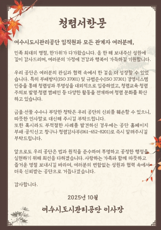 [¹Ìµð¾îÀü³² ÀüÇü¼º ±âÀÚ]¿©¼ö½Ãµµ½Ã°ü¸®°ø´ÜÀº ¹ÎÁ· ÃÖ´ë ¸íÀýÀÎ Ãß¼®À» ¾ÕµÎ°í ÀÓÁ÷¿ø°ú °ü°èÀÚ¿¡°Ô û·Å ¼Çѹ®À» ¹ß¼ÛÇß´Ù°í 2ÀÏ ¹àÇû´Ù. °ø´ÜÀº ¼Çѹ®À» ÅëÇØ ÇÑ ÇØ µ¿¾ÈÀÇ ¼º¿ø¿¡ °¨»ç Àλ縦 ÀüÇϰí, ±Ýǰ¡¤¼±¹° ¼ö¼ö³ª ºÎ´çÇÑ ¡¦