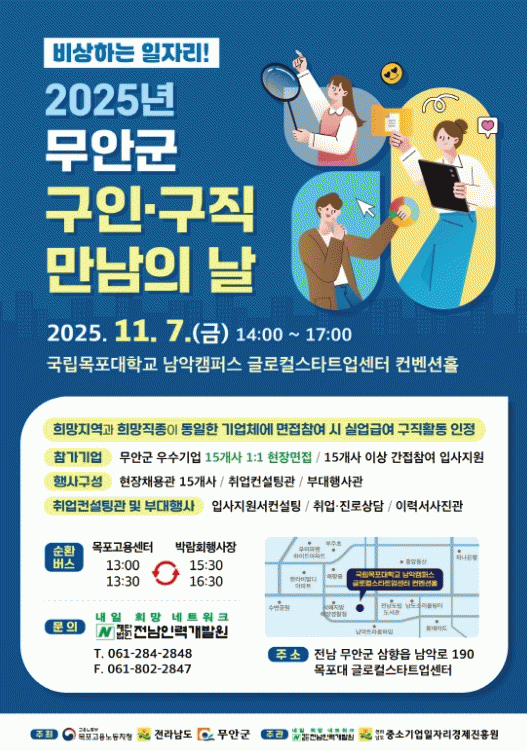 [¹Ìµð¾îÀü³² ±èÆÇ±¹ ±âÀÚ]Àü³² ¹«¾È±ºÀº ¿À´Â 11¿ù 7ÀÏ ¸ñÆ÷´ëÇб³ ³²¾ÇÄ·ÆÛ½º ±Û·ÎÄýºÅ¸Æ®¾÷¼¾ÅÍ ÄÁº¥¼ÇȦ¿¡¼ °³ÃÖÇÏ´Â ¡º2025³â ¹«¾È±º ±¸ÀΡ¤±¸Á÷ ¸¸³²ÀÇ ³¯¡»Çà»ç¿¡ Âü¿©ÇÒ ±â¾÷À» ¸ðÁýÇÑ´Ù. ¡®ºñ»óÇÏ´Â ÀÏÀÚ¸®¡¯¶ó´Â ÁÖÁ¦·Î ¹«¾È¡¦