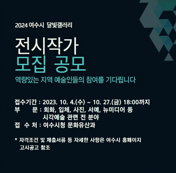 [¹Ìµð¾îÀü³² ÀüÇü¼º ±âÀÚ]¿©¼ö½Ã°¡ ¿À´Â 27ÀϱîÁö 2024³â ´Þºû°¶·¯¸®(°í¼Òµ¿) Àü½Ã ÀÛ°¡¸¦ °ø°³ ¸ðÁýÇÑ´Ù. ¡®´Þºû°¶·¯¸®¡¯´Â ½Ã°¡ ¿ª·® ÀÖ´Â Áö¿ª ÀÛ°¡¸¦ ¹ß±¼ÇØ Àü½Ã ±âȸ¸¦ Á¦°øÇϰí Áö¿ª ¿¹¼úÀΰú ¼ÒÅë ¹× ¿©¼ö ¹Ì¼ú»ç¸¦ ¿¬±¸¸¦ À§¡¦