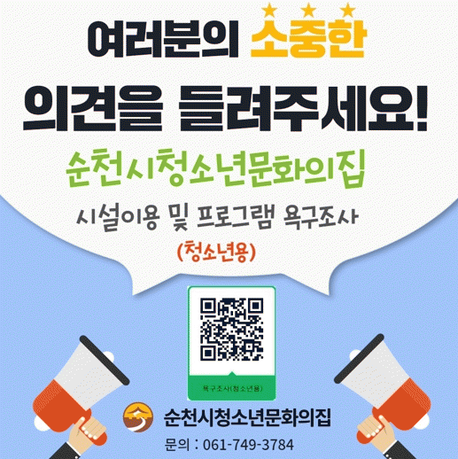 [¹Ìµð¾îÀü³² ÀÓ¼º¿Ï ±âÀÚ]¼øÃµ½Ã û¼Ò³â¹®ÈÀÇÁýÀº 10¿ù 31ÀϱîÁö ¹®ÈÀÇÁý ÀÌ¿ë û¼Ò³â°ú Çкθð 500¸íÀ» ´ë»óÀ¸·Î ¡®2023³â ¼øÃµ½Ãû¼Ò³â¹®ÈÀÇÁý ½Ã¼³ÀÌ¿ë ¹× ÇÁ·Î±×·¥ ¿å±¸Á¶»ç¡¯¸¦ ½Ç½ÃÇÑ´Ù. ÀÌ Á¶»ç´Â ¡ã½Ã¼³ÀÌ¿ë ¡ãû¼Ò³â ÇÁ·Î±×¡¦