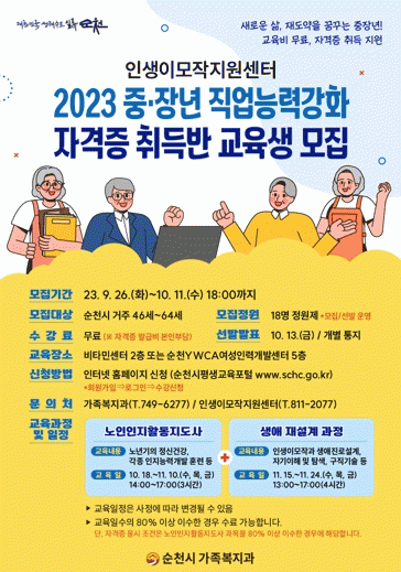 [¹Ìµð¾îÀü³² ÀÓ¼º¿Ï ±âÀÚ]¼øÃµ½Ã´Â Áß¡¤Àå³âÀ» ´ë»óÀ¸·Î Á÷¾÷Àü¹® ´É·Â °È¸¦ À§ÇÑ ÀÚ°ÝÁõ Ãëµæ¹Ý(³ëÀÎȰµ¿Áöµµ»ç)À» °³¼³Çϰí 10¿ù 11ÀϱîÁö ±³À° ¼ö°»ý(18¸í)À» ¸ðÁýÇÑ´Ù°í ¹àÇû´Ù. ÀÚ°ÝÁõ¹Ý °³¼³Àº Ãʰí·ÉÈ »çȸ ÁøÀÔ¿¡ µû¸¥ Áö¿ª¡¦